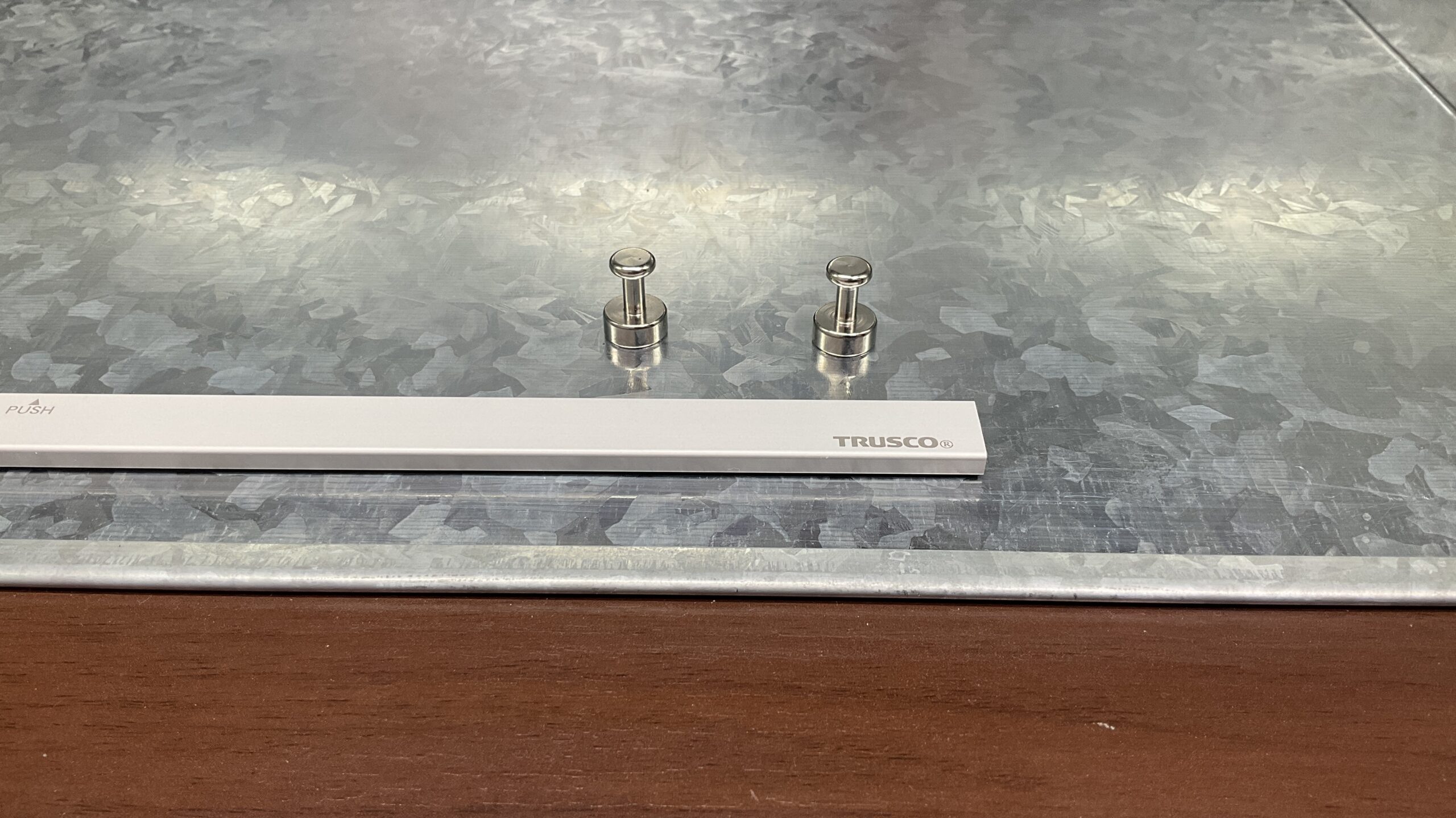 2025年末にブース内を掃除した際にマグネットピンを金属タイプのものに変更しました、またマグネットバーもアルミ製にして耐溶剤性を高めています。